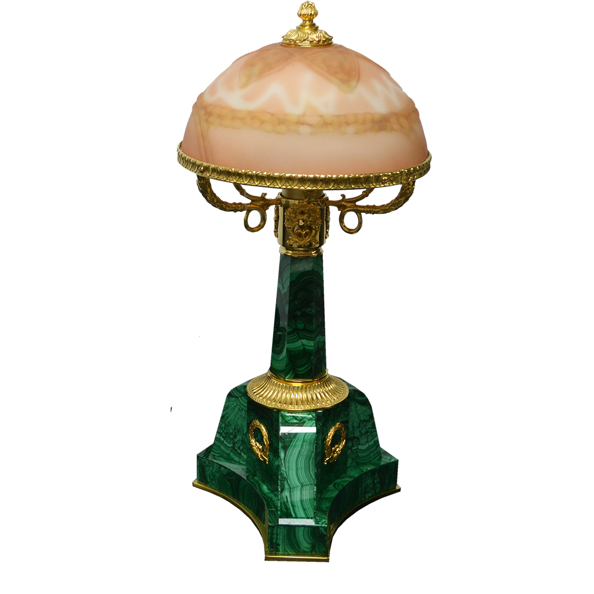 Настольная лампа из малахита Л-МА-13 украсит любой рабочий кабинет или офис. Изготовлена из натурального камня малахита и долерита. Декор — позолоченная бронза и латунь .