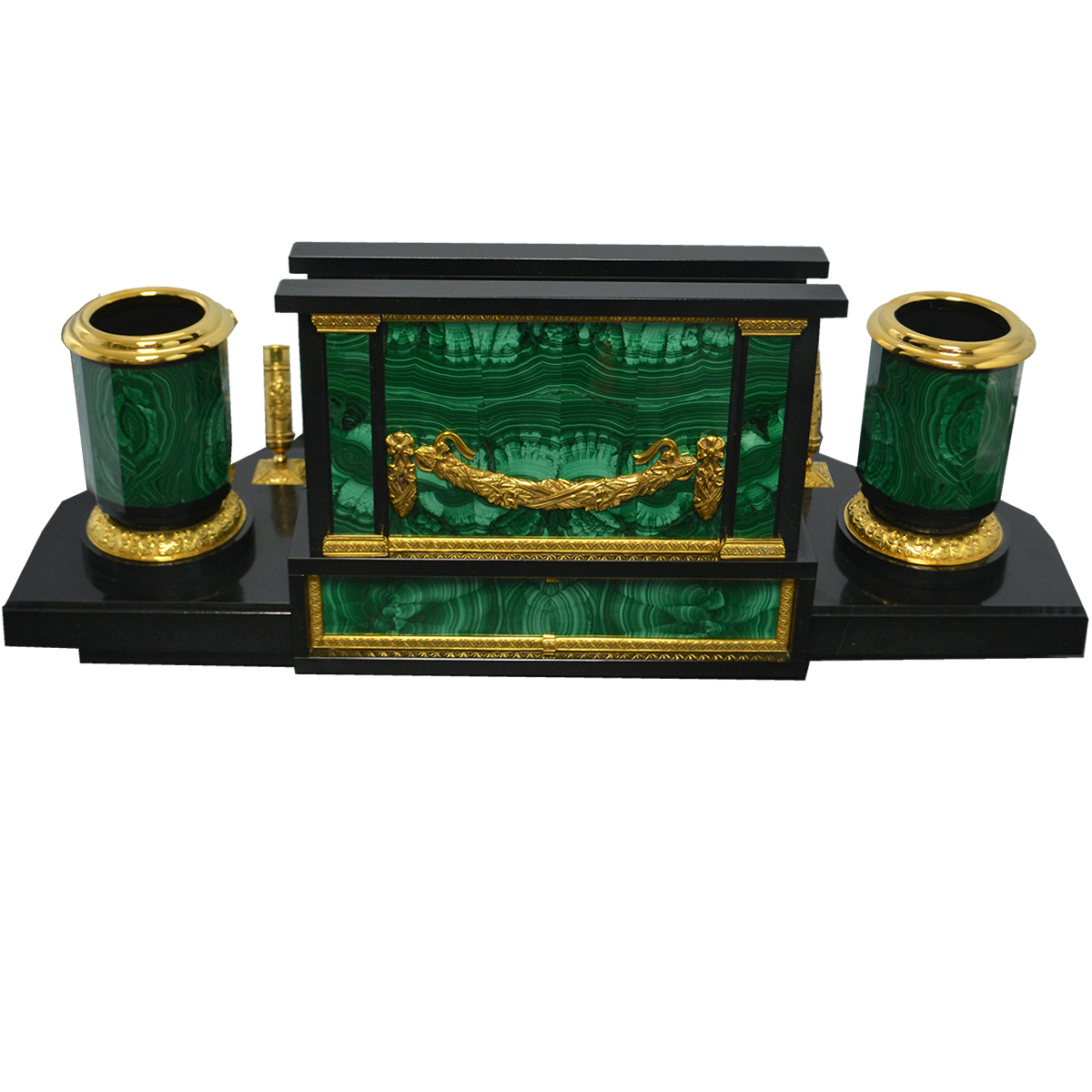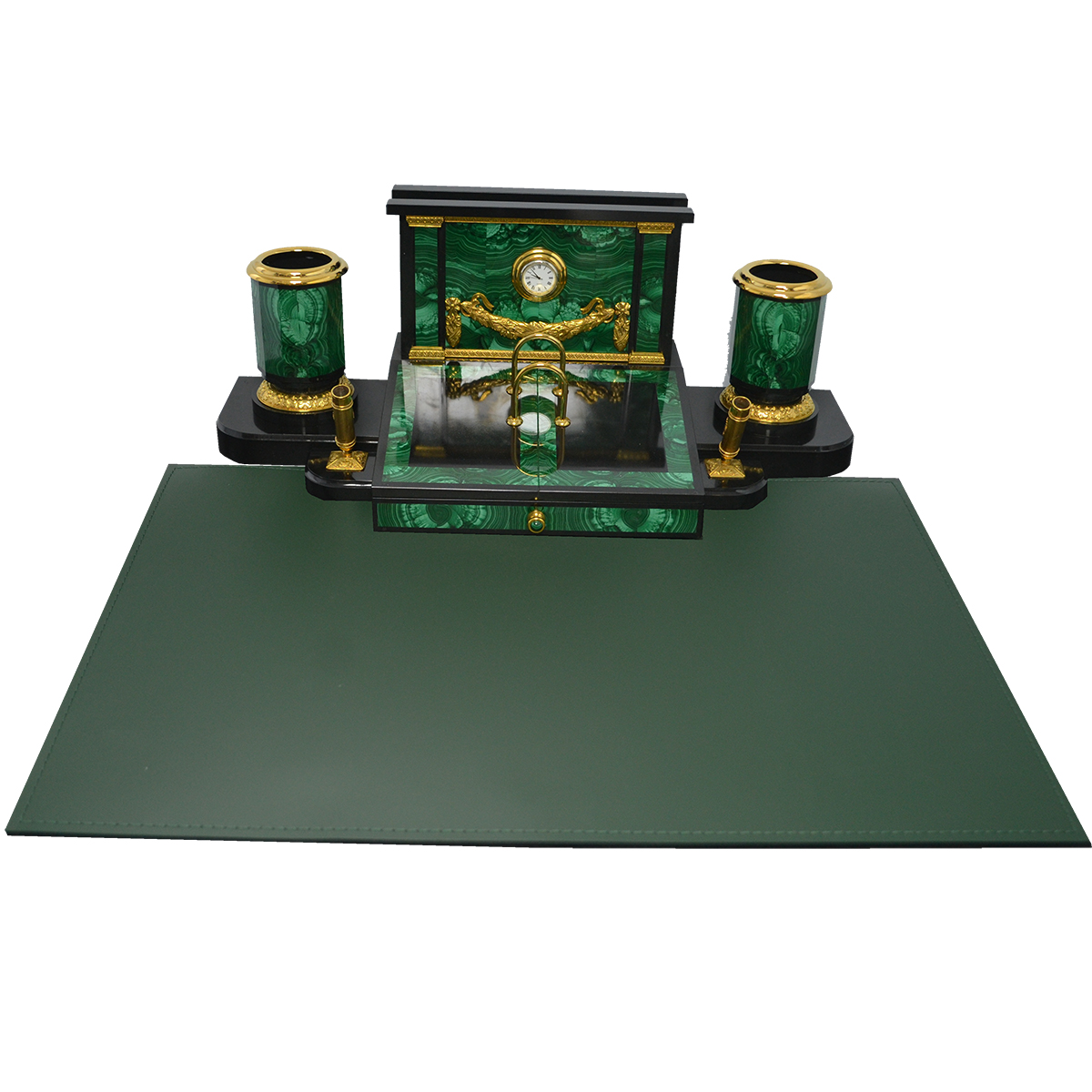 Настольный набор из малахита МА-45 VIP1 украсит любой рабочий кабинет или офис. Он изготовлен из малахита и долерита. Декор — позолоченная бронза и латунь. Бювар из итальянской натуральной кожи