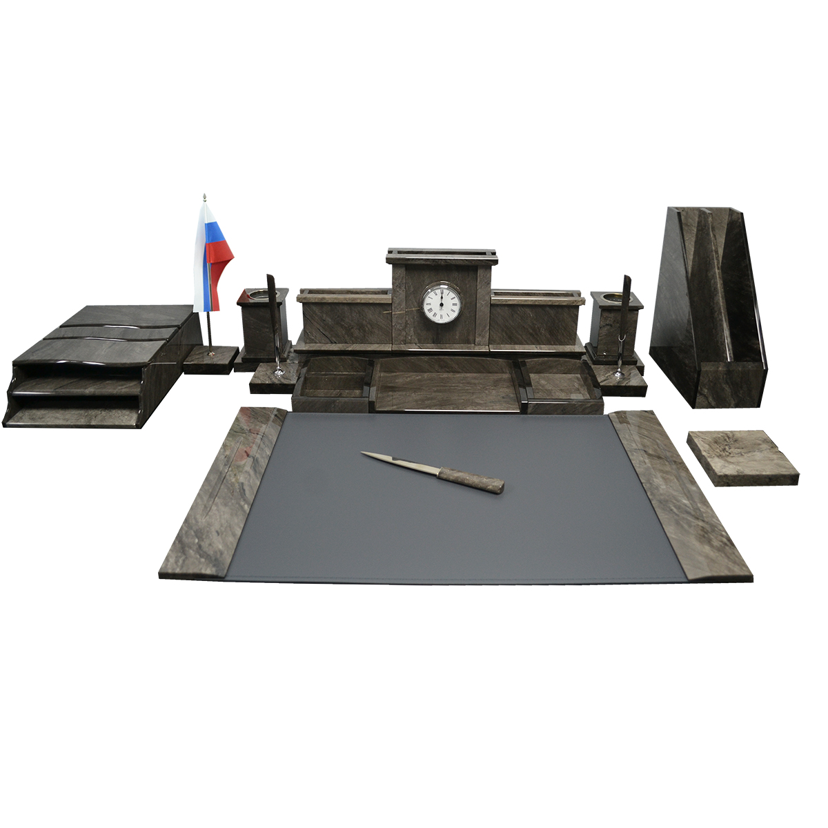 Настольный набор для руководителя из серого обсидиана «Королевский 4-15-VIP6» украсит любой рабочий кабинет или офис. Он изготовлен из натурального камня обсидиан. Декор — бронза и латунь.